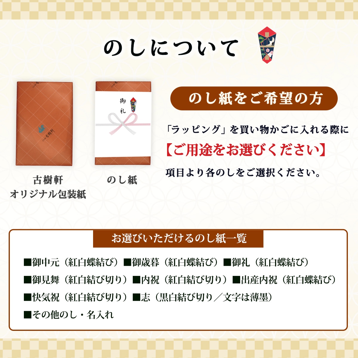 結婚記念日や誕生日、父の日や母の日など、大切な記念日に! 美味しさはもちろん、あなたの気持ちも一緒にお届けできるよう、ひとつひとつ、心を込めてラッピングいたします。 古樹軒オリジナル包装紙で高級感溢れる装いは、大切な方にお届けするギフトにぴったり。心を込めて美しく包みます。